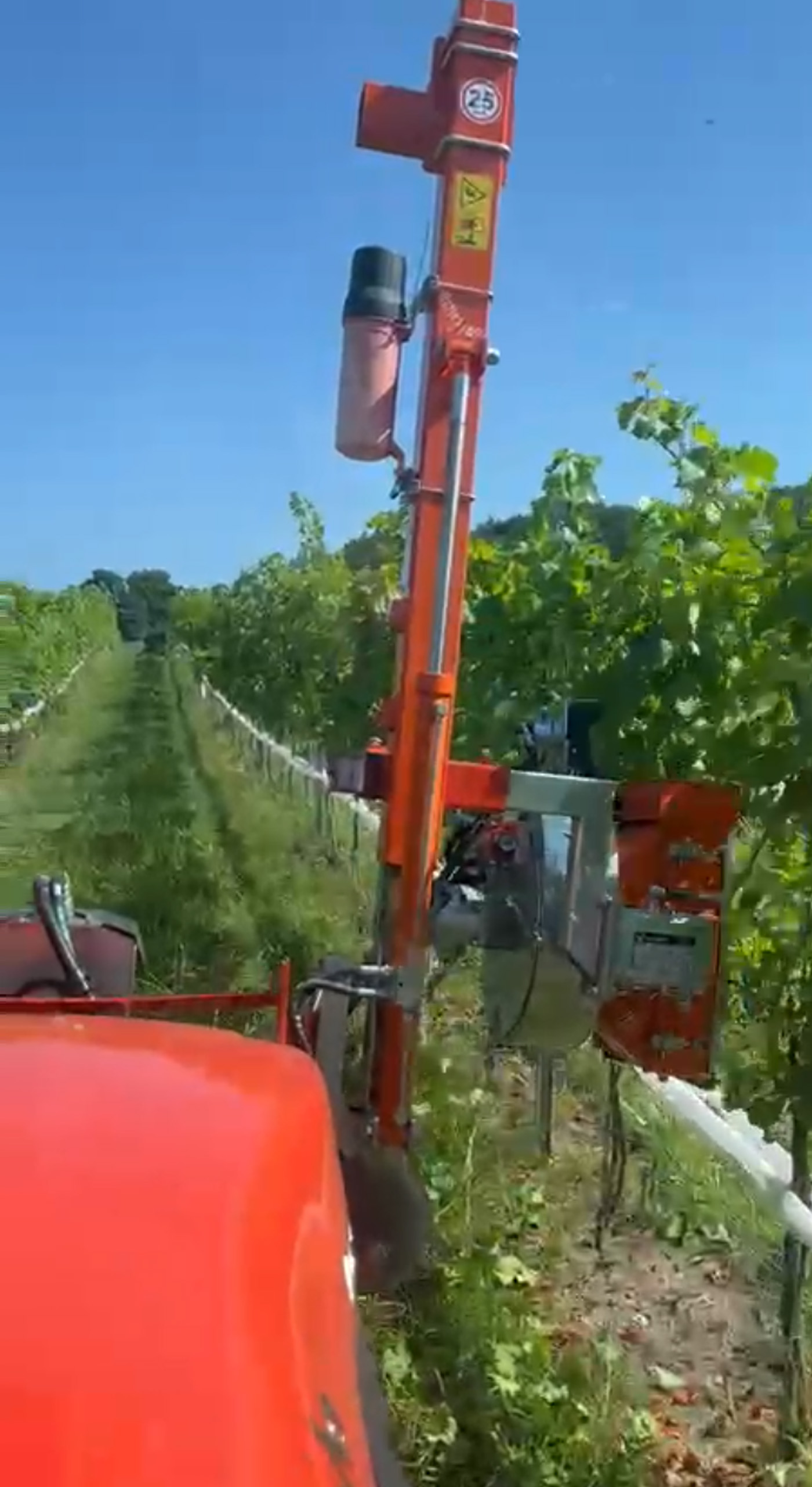 The new double barrel leaf remover DRF is the answer to the needs of the modern vineyards. The machine removes the leaves from the grape zone, that increases maturation and aeration reducing spraying chemicals. The machine consists in two opposite rollers, one with holes and the other with rubber, which allow a perfect and safe removal of the leaves without damaging the grapes thanks also to the stainless protection shield steel which follows the vines wall. Aspiration is provided by a fan equipped with hydraulic motor. The DRF can be mounted on VISION frame or turning frame which allows to defoliate only the side not exposed to the sun without losing any time for the ride back.